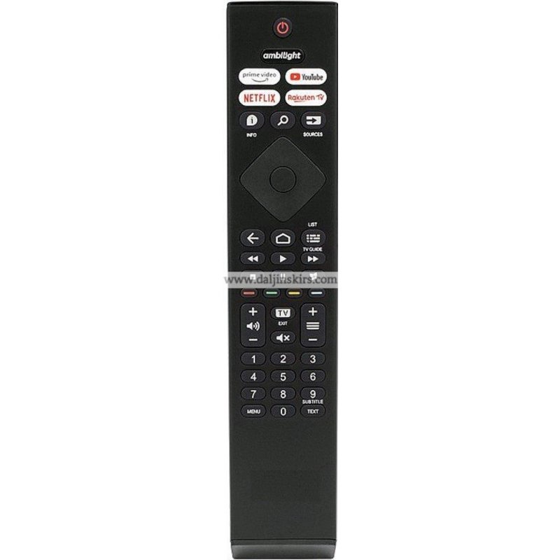 Daljinski upravljač kompatibilan sa Philips Smart LED i LCD televizorima, sa direktnim pristupom za Netflix, YouTube, Prime Video i Rakuten TV — identično kao fabrički original. Podržava kompletan Smart TV meni, internet servise, multimediju, titlove, TV vodič i sve standardne funkcije.